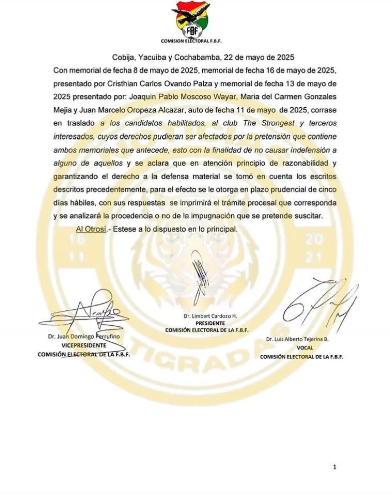 “Córrase en traslado a los candidatos habilitados al club The Strongest y terceros interesados, cuyos derechos pudieran ser afectados por la pretensión que contienen ambos memoriales que anteceden (los que envió Renovación Atigrada), esto con la finalidad de no causar indefensión a alguno de aquellos y se aclara que, en atención al principio de razonabilidad y garantizando el derecho a la defensa material, se tomó en cuenta los escritos descritos precedentemente”, dice una parte del documento.