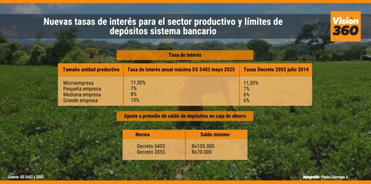 Se mantiene 11,5% para microempresa y 7% pequeña empresa. Los límites en caja de ahorro suben de Bs 70.000 a Bs 100.000 con el fin de promover los depósitos.