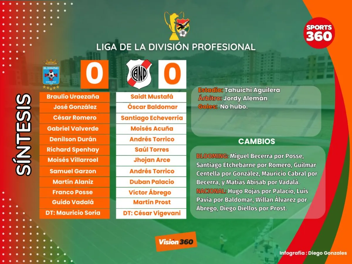 Blooming no pudo ampliar su racha positiva de victorias en condición de local y se resignó a perder dos unidades al empatar con Nacional Potosí sin goles, este sábado en el estadio Gilberto Parada de Montero, por la novena jornada del torneo Liga de la División Profesional.
