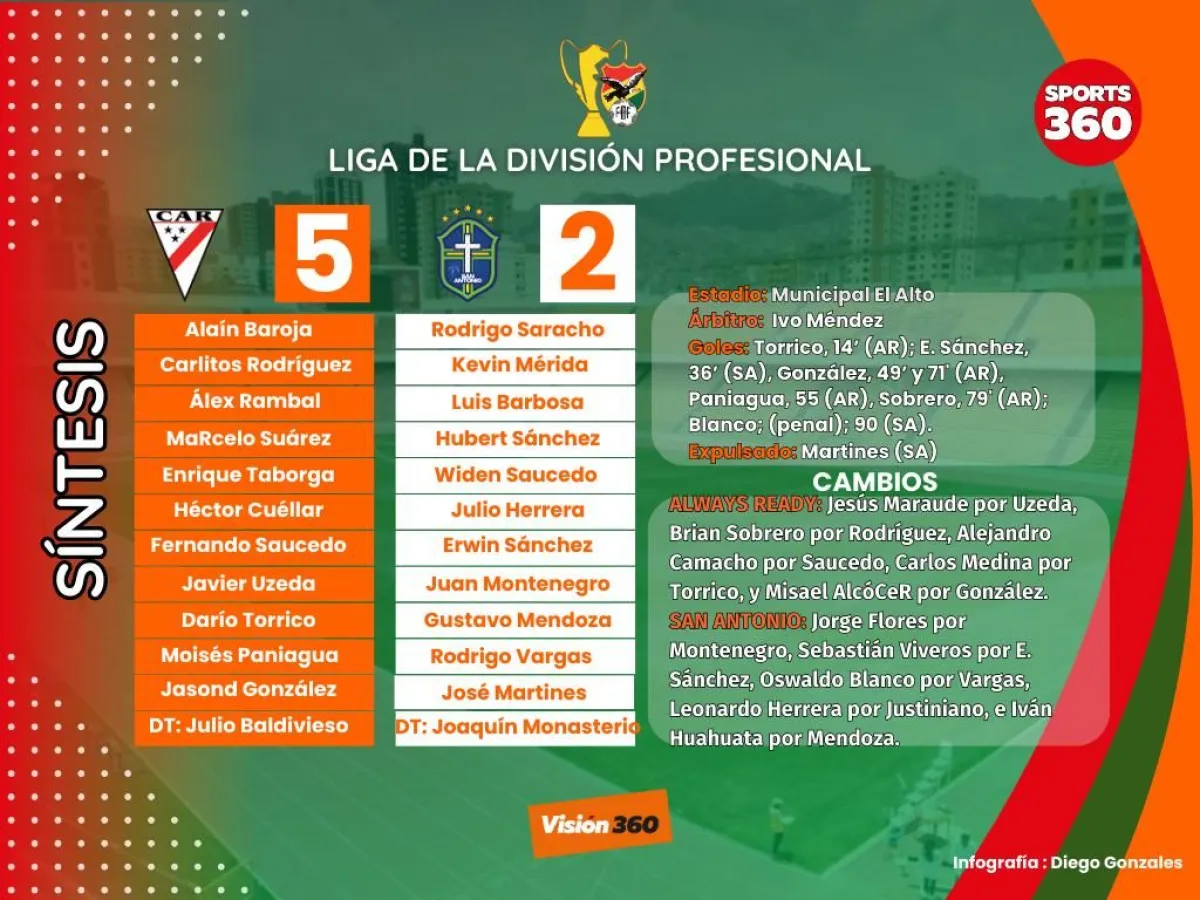 Always Ready regresó a la senda del triunfo después de dos empates seguidos. Goleó 5-2 a San Antonio este domingo en el estadio Municipal El Alto, en Villa Ingenio, y se va al receso gozando de su condición del cómodo líder del torneo Liga de la División Profesional.