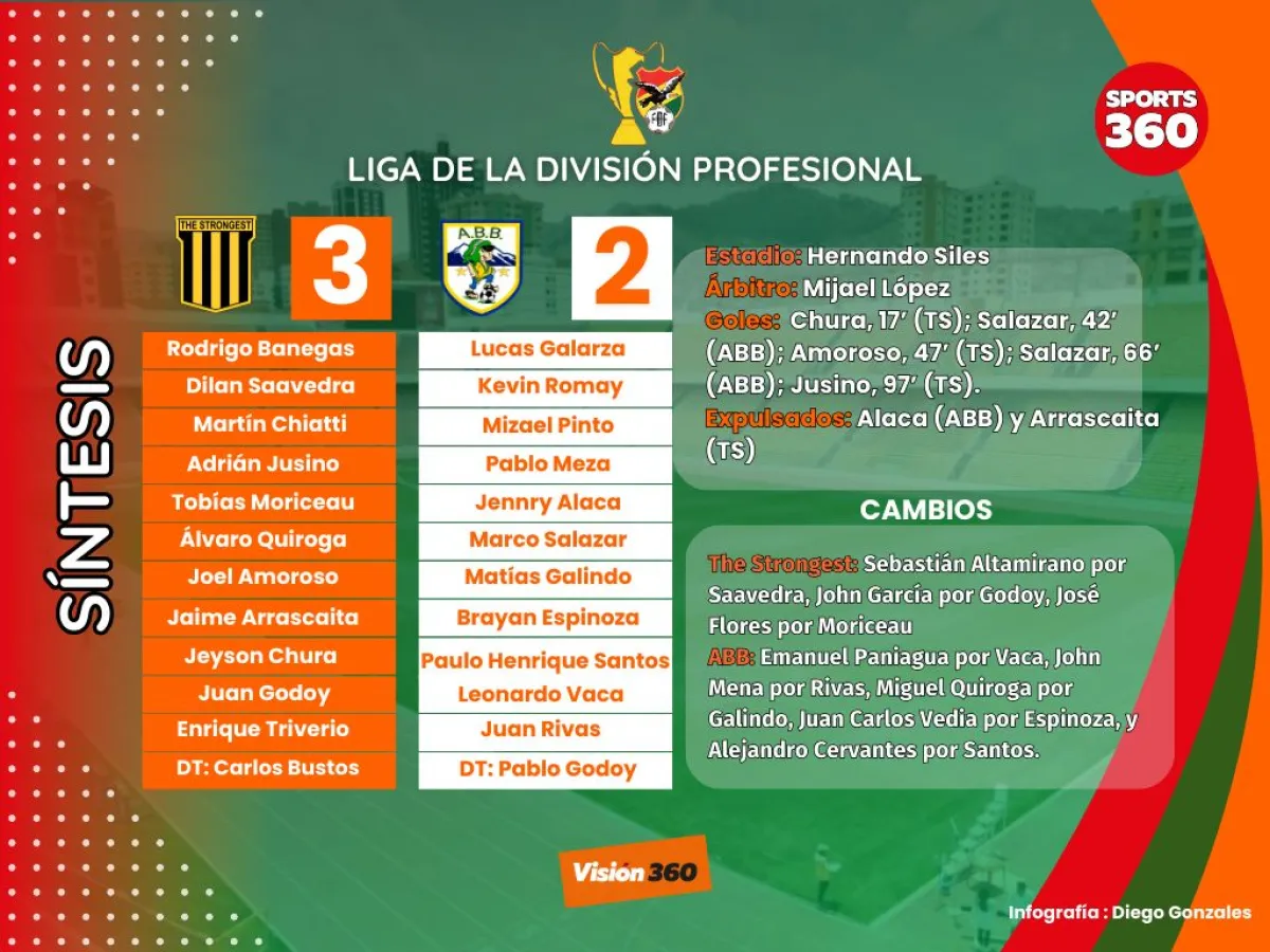 The Strongest dio alcance a Bolívar en el segundo lugar de las posiciones en la Liga de la División Profesional con una agónica victoria 3-2 sobre ABB, este lunes en el estadio Hernando Siles, en el complemento de la novena jornada.