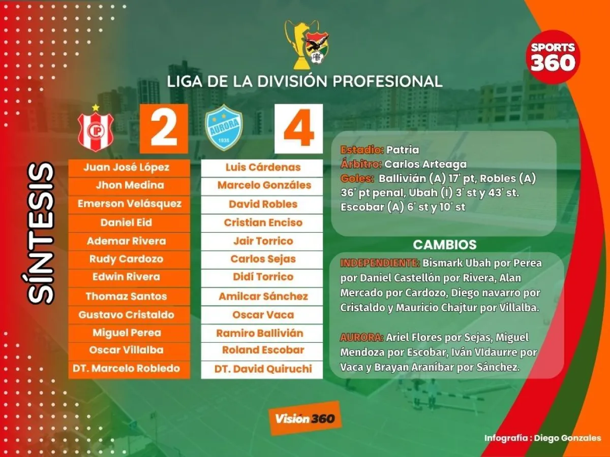 Aurora goleó en condición de visitante a Independiente (4-2) y se regaló un triunfo en vísperas de su cumpleaños 90, en una jornada en la que horas antes conoció el fallo del Tribunal Superior de Apelaciones que ratificó la resta de 33 unidades al Equipo del Pueblo.