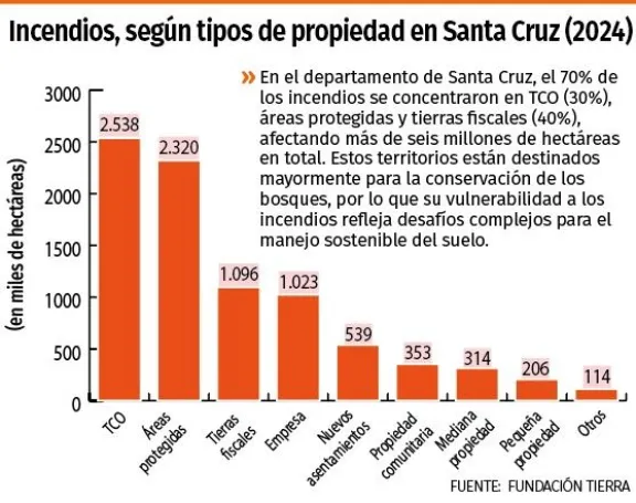 Los incendios, en Santa Cruz, han impactado, principalmente, en territorios indígenas, áreas protegidas y tierras fiscales, seguidos por empresas agropecuarias y nuevas ocupaciones. La distribución de los incendios sugiere una mayor vulnerabilidad en regiones con alta cobertura boscosa y zonas de conservación.