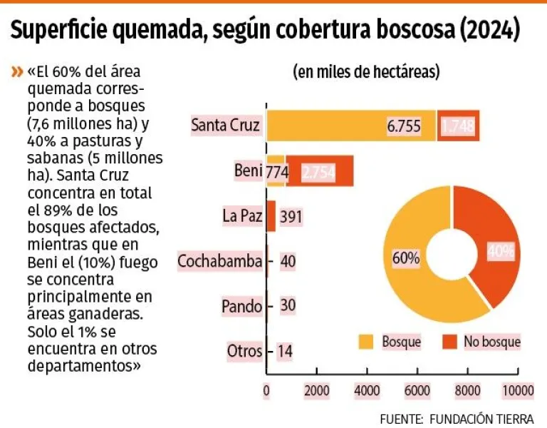 “A nivel nacional, el área quemada durante el año 2024 alcanza a 12,6 millones de hectáreas. Es la cifra más alta registrada en la historia boliviana, dejando en segundo lugar lo sucedido en 2019, cuando se quemaron 5,3 millones de hectáreas en Bolivia”, señala la investigación.