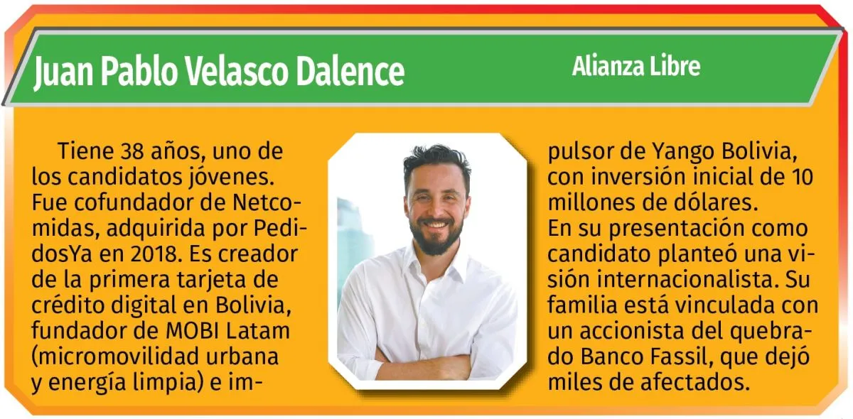De los 10 registrados, solo una es mujer: la ex ministra  Mariana Prado. Se suman el dirigente campesino Milán Berna  y el dirigente gremial Felipe Quispe. El resto son personajes con alta experiencia en economía, como José Luis Lupo, acompañante de Samuel Doria Medina; o Antonio Saravia, por ADN; en política como Jorge  Richter de Morena; o sobresalientes emprendedores tecnológicos como Juan Pablo Velasco, dupla de Jorge Quiroga.