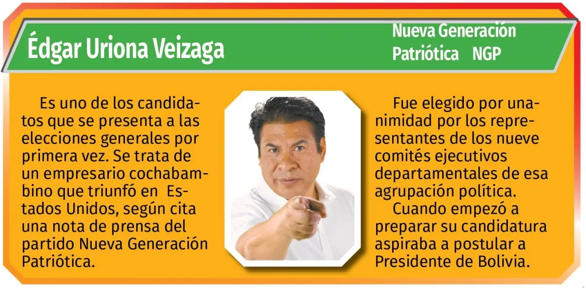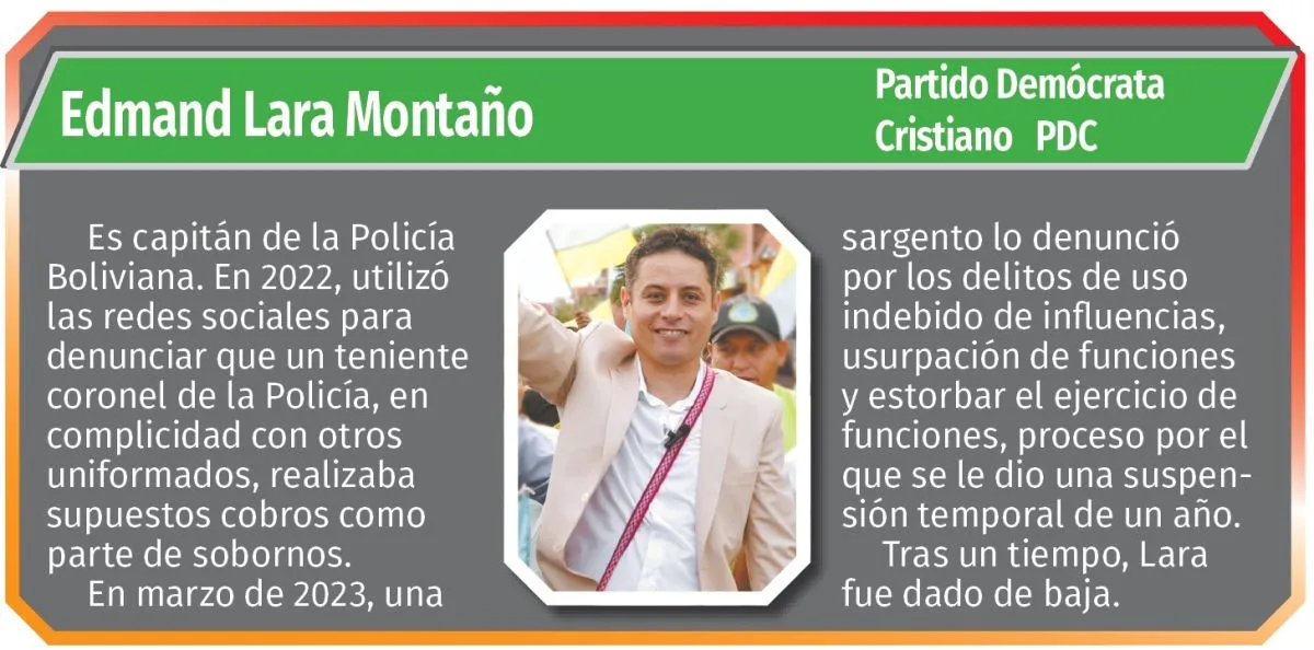 También está una autoridad ya electa como Juan Carlos Medrano, quien acompaña al candidato Manfred Reyes Villa o el capitán Edmand Lara, exmiembro de la Policía Boliviana. No puede faltar Uriona, quien es un primerizo en temas electorales.
