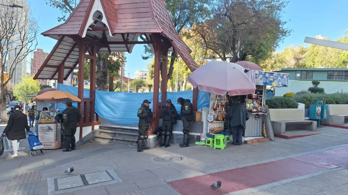 Persisten los cordones de seguridad en las calles cercanas y control de accesos en la plaza Abaroa.