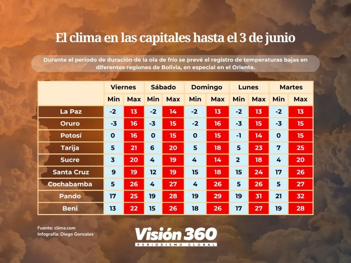 En Santa Cruz, con la llegada del primer ‘surazo’ del año, desde el municipio de Vallegrande se comunicó que, la madrugada del jueves, se registró la primera helada del año, con temperaturas que descendieron hasta los -1,2°C en zonas bajas, según el informe del director de Desarrollo Productivo de la municipalidad, Carlos Vargas, reportó Unitel.