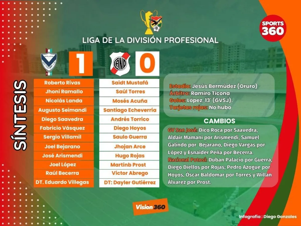GV San José le puso punto final a una racha negativa de cinco partidos sin triunfos en la Liga de la División Profesional —tres derrotas y dos empates— tras ganarle a Nacional Potosí por 2 a 1, partido reprogramado de la séptima fecha, que se jugó en la tarde de este domingo en el estadio Jesús Bermúdez, de la ciudad de Oruro.
