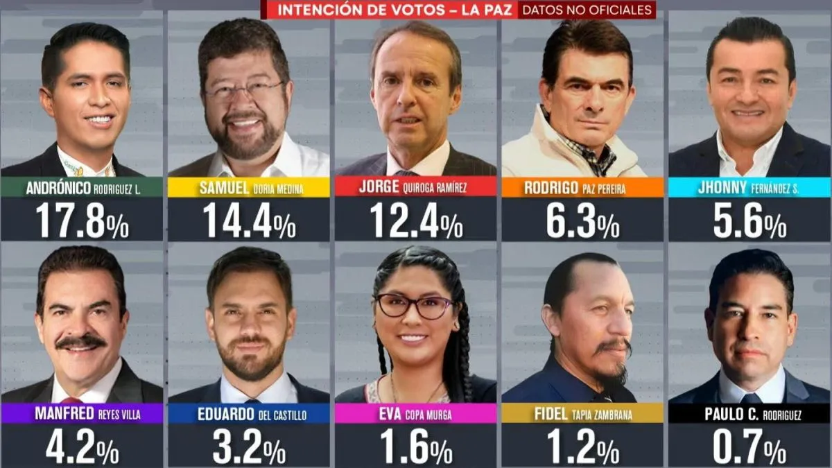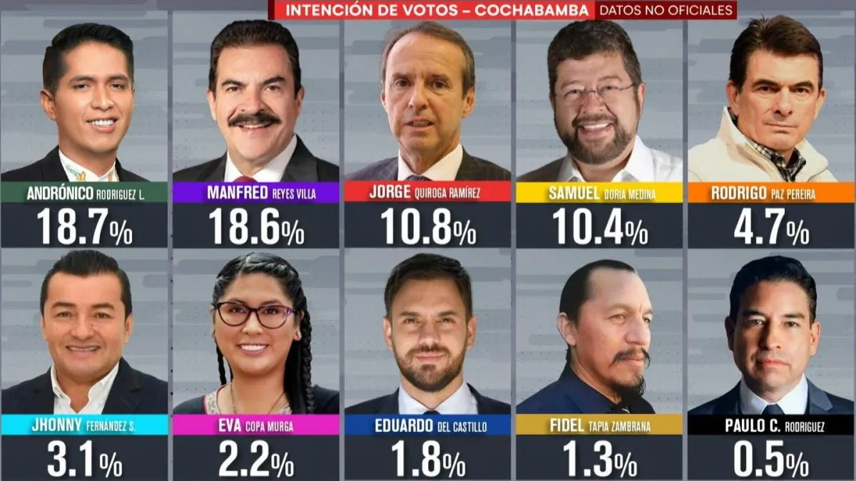 El segundo lugar en la intención de voto lo ocupa Jorge Tuto Quiroga con el 18,4% y el tercero, Andrónico Rodríguez.