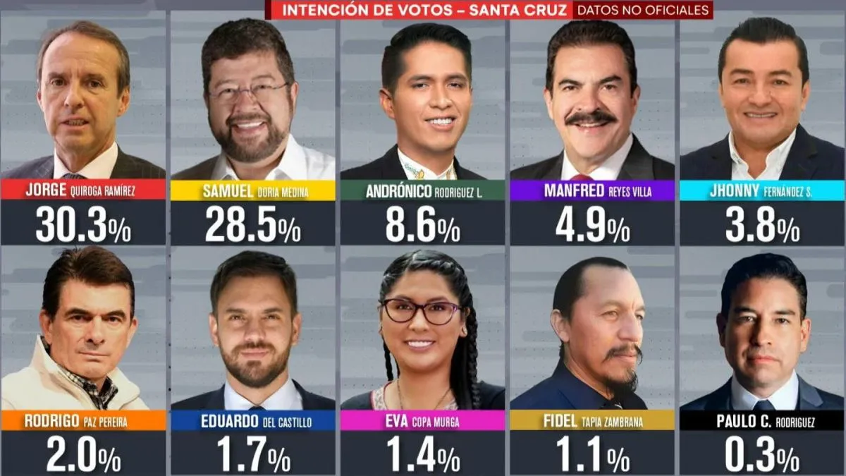 Con 19,1% de apoyo, el actual candidato por la alianza Unidad, el empresario Samuel Doria Medina, encabeza la primera encuesta de intención de voto que incluye a los 10 binomios inscritos ante el Tribunal Supremo Electoral (TSE) rumbo a las elecciones generales del domingo 17 de agosto.