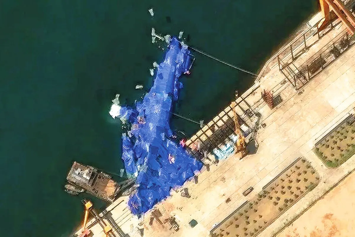 Pero cuando los ingenieros intentaron empujar el destructor norcoreano al agua, perdió el equilibrio. Las imágenes de satélite tomadas dos días después del accidente mostraban el barco cubierto con una lona azul y tumbado sobre su costado derecho. La proa estaba atascada en la rampa y la popa sobresalía hacia el puerto. El mirador había sido retirado.