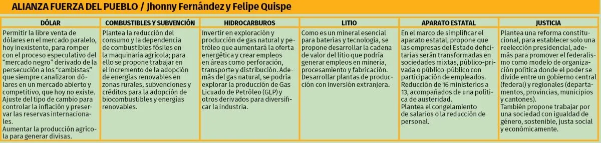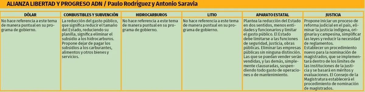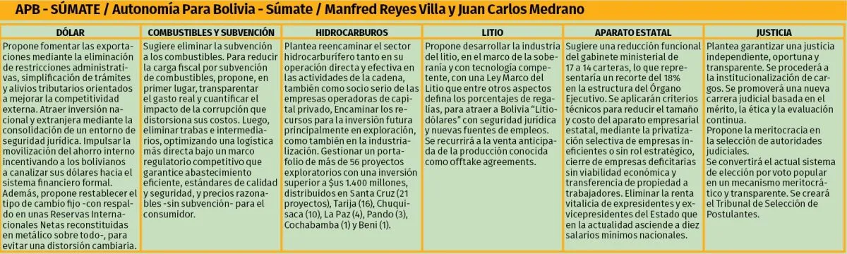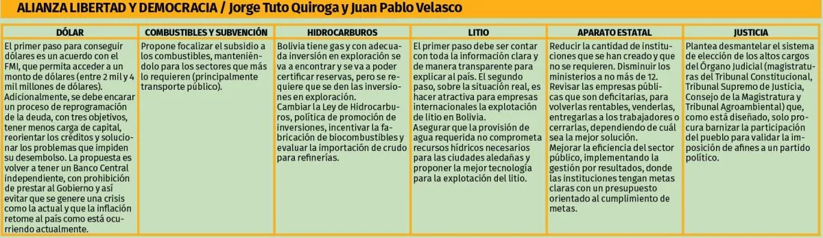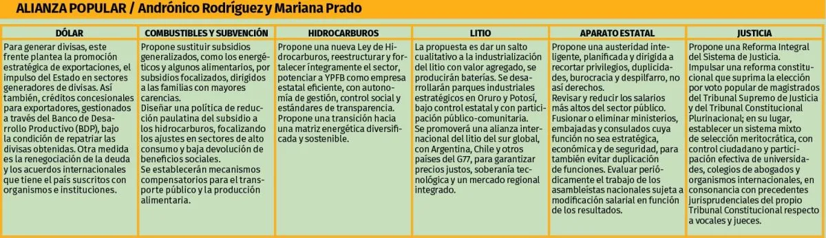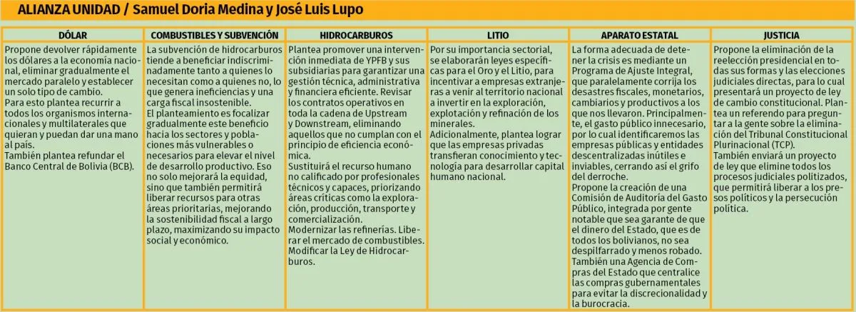 Por ejemplo, en el tema de la subvención a los combustibles, Alianza Popular, que postula a Andrónico Rodríguez, plantea una reducción paulatina a la subvención a los hidrocarburos; Alianza Libertad y Democracia, cuyo candidato es Jorge Quiroga, señala focalizar el subsidio y mantenerlo para los sectores que más lo necesitan; Alianza Unidad, que va con Samuel Doria Medina, propone también la focalización.