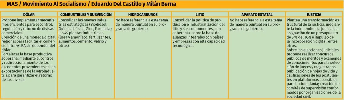 Visión 360 hizo una revisión detallada de los programas de los 10 frentes, tomando en cuenta seis ejes: justicia, aparato estatal, litio, hidrocarburos, dólar y subvención a los combustibles. Con toda esa información elaboró una sistematización de datos que se puede consultar en la siguiente infografía interactiva o en los recuadros que se enucentan en la parte inferior.