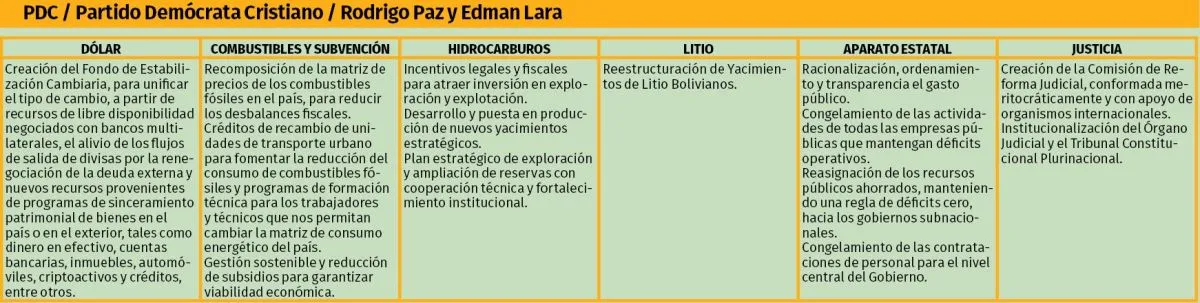 En el grupo de partidos políticos que van de manera independiente, es decir, sin haber conformado alianza, se encuentra el Partido Demócrata Cristiano (PDC),  que va con Rodrigo Paz y propone una gestión sostenible y reducción de subsidios para garantizar viabilidad económica.