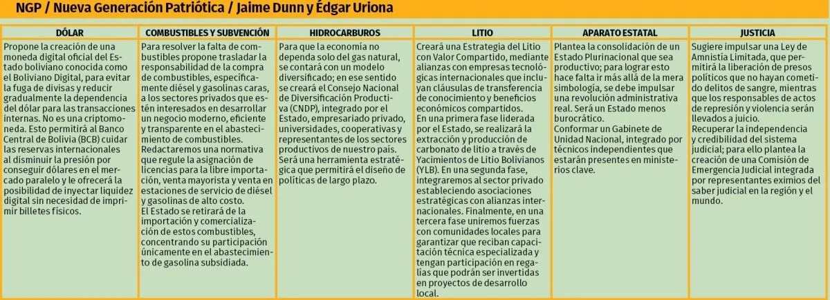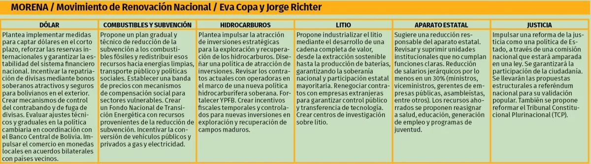 El Movimiento de Renovación Nacional (Morena), que va con Eva Copa, propone un plan gradual y técnico de reducción de la subvención a los combustibles fósiles; la Nueva Generación Patriótica (NGP), que postula a Jaime Dunn, señala trasladar la responsabilidad de comprar combustibles al sector privado.