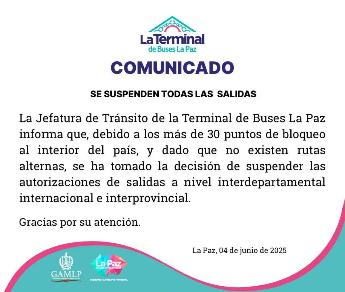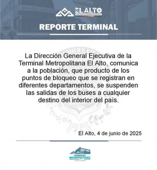 “La Dirección General Ejecutiva de la Terminal Metropolitana El Alto comunica a la población, que producto de los puntos de bloqueo que se registran en diferentes departamentos, se suspenden las salidas de los buses a cualquier destino del interior del país”, dice un comunicado.