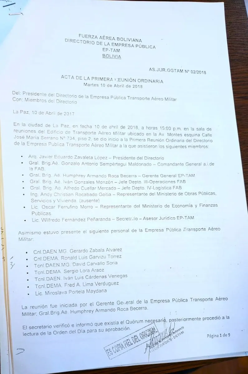 El documento señala que a dicha reunión asistieron las entonces autoridades, ministro Zavaleta; el Comandante de la Fuerza Aérea Boliviana (FAB), Gonzalo Sempértegui; el gerente general del EP TAM, Armando Roca; los jefes de los departamentos de operaciones y logística de la FAB, Iván Gonzales y Alfredo Cuéllar; además de dos representantes, uno del Ministerio de Obras Públicas y otro del Ministerio de Economía y Finanzas, Andy Rocabado, y Óscar Ferrufino, respectivamente.