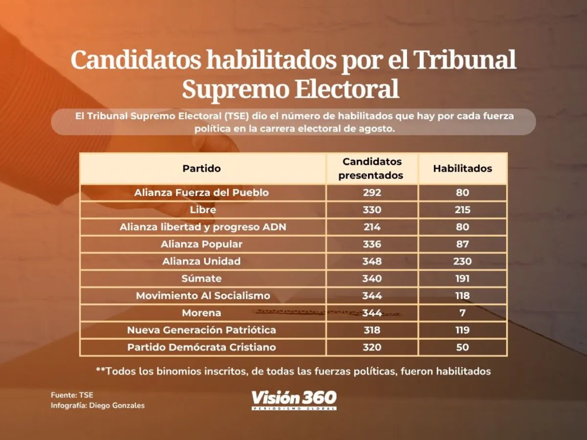 El presidente en ejercicio del Tribunal Supremo Electoral (TSE), Oscar Hassenteufel, informó este viernes que ninguno de los candidatos a las elecciones de agosto ha sido inhabilitado para participar en las elecciones de agosto próximo, pero dijo que el candidato Jaime Dunn, por la Nueva Generación Patriótica (NGP), no figura en ninguna lista.