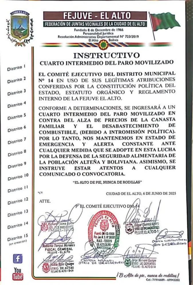 “Conforme a determinaciones, se ingresará a un cuarto intermedio del paro movilizado en contra del alza de precios de la canasta familiar y emergencia y comunicado o convocatoria. cualquier medida que se adopte en esta lucha por la defensa de la seguridad alimentaria de la población alteña y boliviana. Asimismo, se instruye estar atentos el desabastecimiento de combustible, (debido a intromisión política). por lo tanto, nos mantenemos en estado de alerta constante ante a cualquier comunicado o convocatoria”, dice el instructivo.