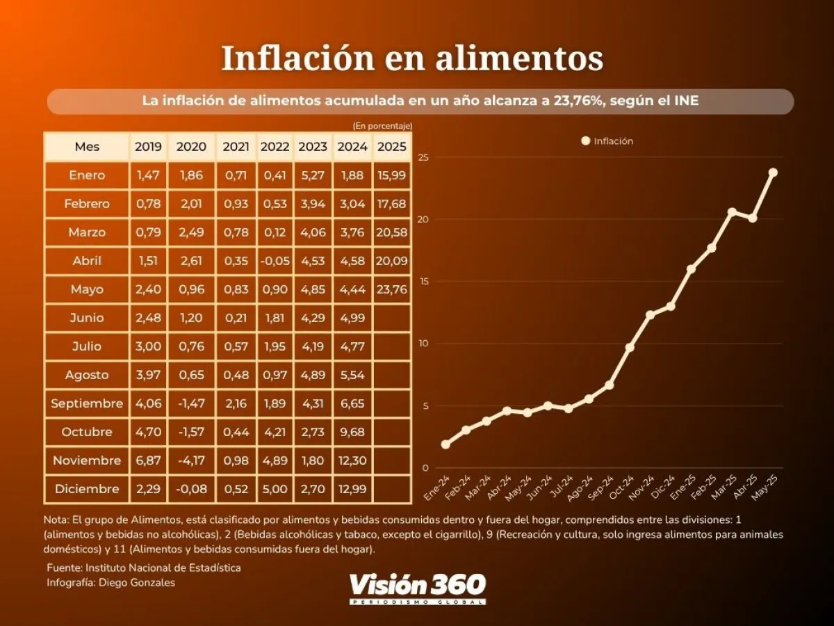 Los alimentos le cuestan a la población un 23,76% más que hace un año, mientras que la inflación acumulada en cinco meses (hasta mayo) asciende a 12,17%, más que la tasa general del Índice de Precios al Consumidor (IPC), según revelan los datos del Instituto Nacional de Estadística (INE).
