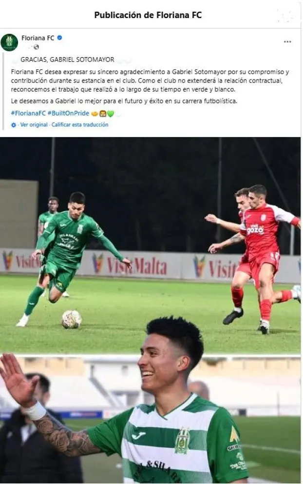 “GRACIAS, GABRIEL SOTOMAYOR. Floriana FC desea expresar su sincero agradecimiento a Gabriel Sotomayor por su compromiso y contribución durante su estancia en el club. Como el club no extenderá la relación contractual, reconocemos el trabajo que realizó a lo largo de su tiempo en verde y blanco.