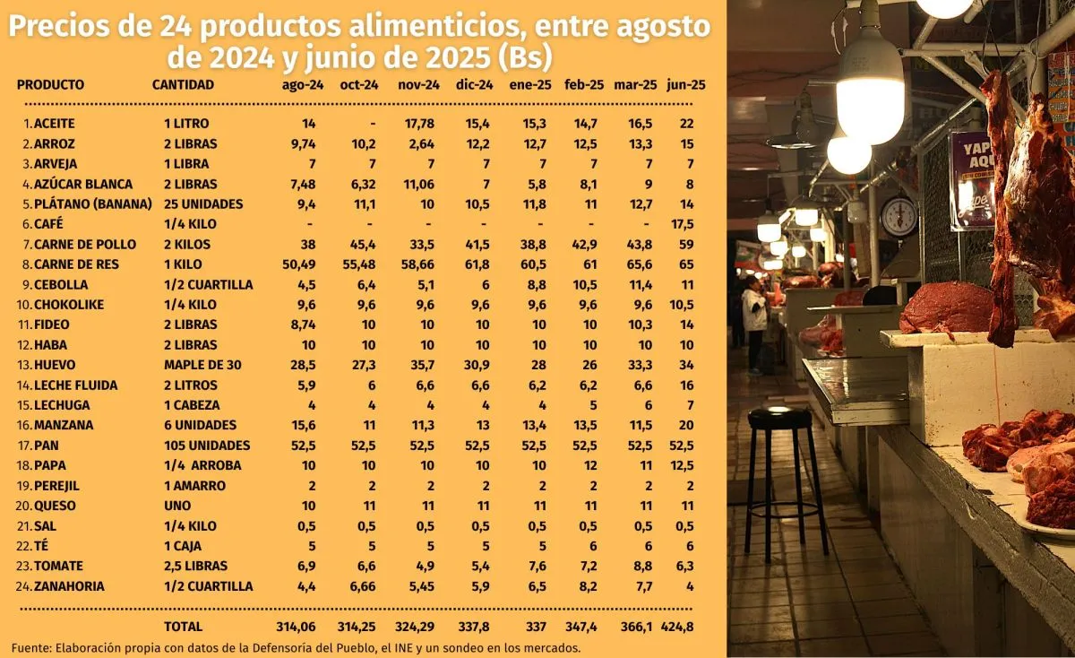 En agosto del año pasado, el costo de estos productos era de 314,25 bolivianos, de acuerdo con el “Sondeo de precios de productos de consumo general”, realizado mensualmente por la Defensoría del Pueblo, de agosto de 2024 a marzo de 2025. El incremento es de más de 100 bolivianos, aunque la percepción en el bolsillo de los bolivianos y bolivianas pareciera ser mucho mayor, y es que todo sube -no solo los alimentos- y los ingresos se vuelven cada vez menos valiosos para repartirlos.