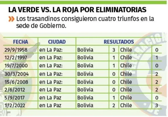 A la selección chilena no le va mal frente a Bolivia en condición de visitante. La Roja tiene cuatro victorias y un empate por eliminatorias en condición de visitante, es decir, un rendimiento del 55%.