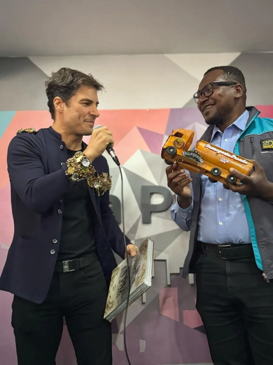 El Secretario de Culturas del Gobierno Municipal de La Paz, Américo Gemio, le hizo entrega de un libro de fotografías de la ciudad de La Paz, así como una matraca de madera, en alusión a la entrada del Gran Poder que se realizará este sábado.