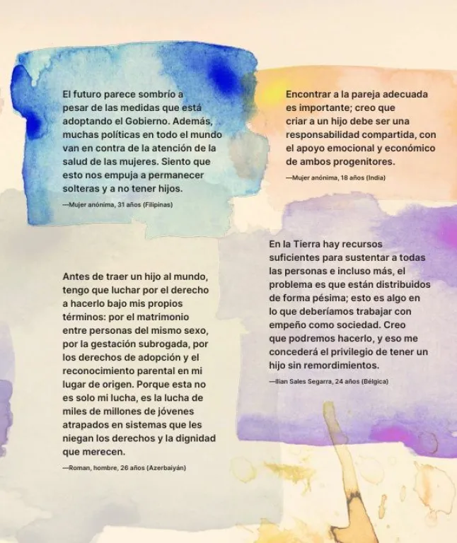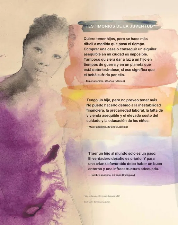 Unfpa informó que, considerando diversas investigaciones académicas y nuevos datos de una encuesta de esta institución y YouGov en 14 países, el informe revela que una de cada cinco personas a nivel global piensa que alcanzar el número de hijos e hijas deseados sería imposible por factores como las limitaciones financieras, la inseguridad laboral, el costo de la vivienda, motivos de salud, las inquietudes sobre el estado del mundo e incluso la falta de una pareja adecuada.