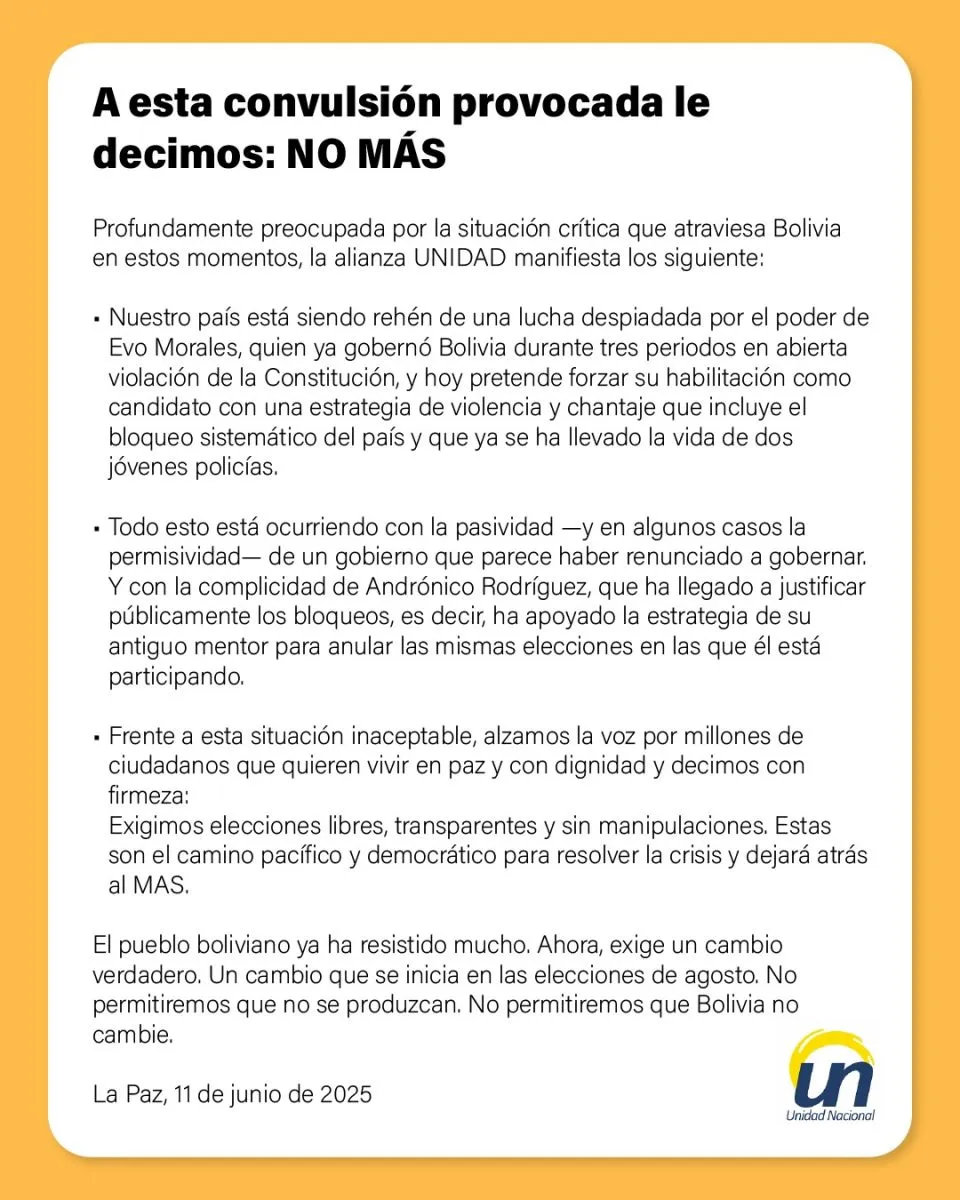 La alianza Unidad emitió un comunicado en el que cuestiona la pasividad del Gobierno ante la violencia ejercida por los grupos afines a Evo Morales que bloquean diferentes carreteras. Se exigió se garantice  las elecciones libres, transparentes y sin manipulaciones.