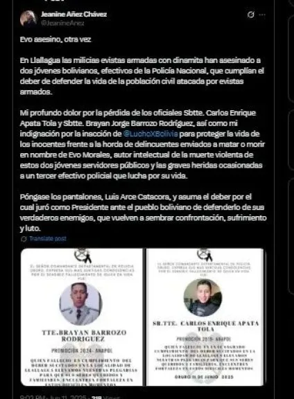“En Llallagua las milicias evistas armadas con dinamita han asesinado a dos jóvenes bolivianos, efectivos de la Policía Nacional, que cumplían el deber de defender la vida de la población civil atacada por evistas armados. Mi profundo dolor por la pérdida de los oficiales Sbtte. Carlos Enrique Apata Tola y Sbtte. Brayan Jorge Barrozo Rodríguez, así como mi indignación por la inacción de ‘Lucho’ para proteger la vida de los inocentes frente a la horda de delincuentes enviados a matar o morir en nombre de Evo Morales, autor intelectual de la muerte violenta de estos dos jóvenes servidores públicos y las graves heridas ocasionadas a un tercer efectivo policial que lucha por su vida”, afirma la exautoridad en sus redes sociales.