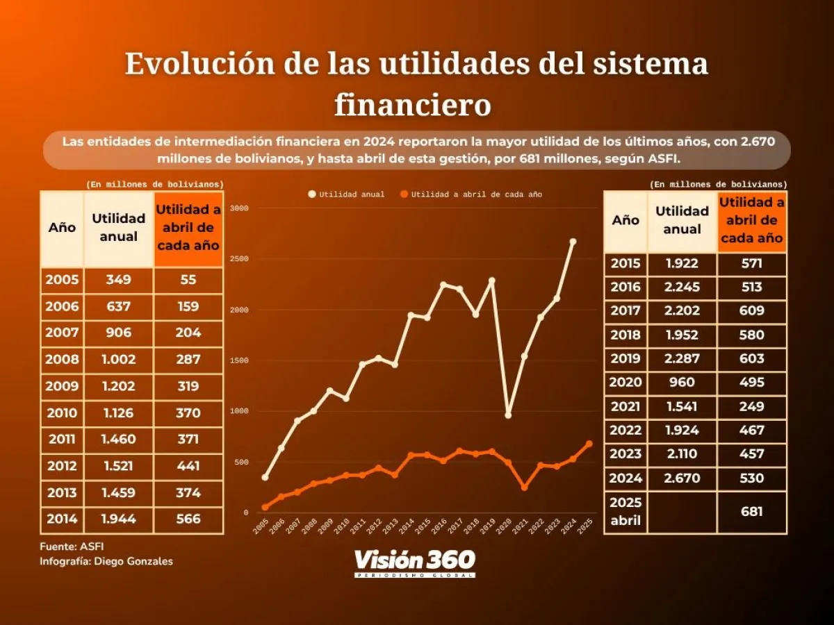 Las cifras de la ASFI revelan que el año pasado las entidades de intermediación financiera obtuvieron una utilidad neta de 2.670 millones de bolivianos, la más alta de los últimos años, mientras que al mes de abril de 2025, los beneficios ascienden a 681 millones de bolivianos.