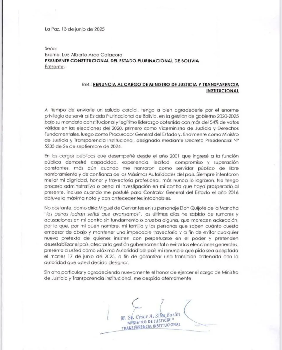 Siles indica en su carta que pidió al Gobierno que la renuncia sea efectiva el martes, 17 de junio, algo que el Ejecutivo aceptó a fin de que la transición en el ministerio de Justicia sea ordenada, según la viceministra de Comunicación, Gabriela Alcón.