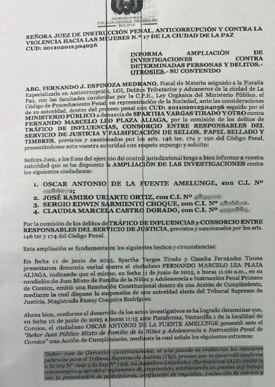 Visión 360 accedió a una resolución de ampliación de la investigación firmada por el fiscal Espinoza, en contra de De la Fuente, su abogado, José Uriarte; la vocal Castro y el encargado del sorteo de causas de Coroico, Sergio Sarmiento.