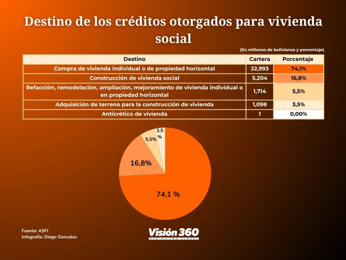 El 74,1% (22.993 millones de bolivianos) fue destinado por los prestatarios a la compra de vivienda individual o en propiedad horizontal: el 16,8% (5.204 millones de bolivianos) fue dirigido a la construcción de vivienda individual; el 5,5% (1.714 millones de bolivianos) a la refacción, remodelación, ampliación y mejoramiento de vivienda individual o en propiedad horizontal. El resto, 3,5%, a la adquisición de terreno para la construcción de vivienda.