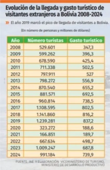$us 837 millones fue el gasto turístico en 2019, cuando llegaron a Bolivia un total de 1.239.281 turistas del exterior para conocer los atractivos que hay en el país en todo su territorio.