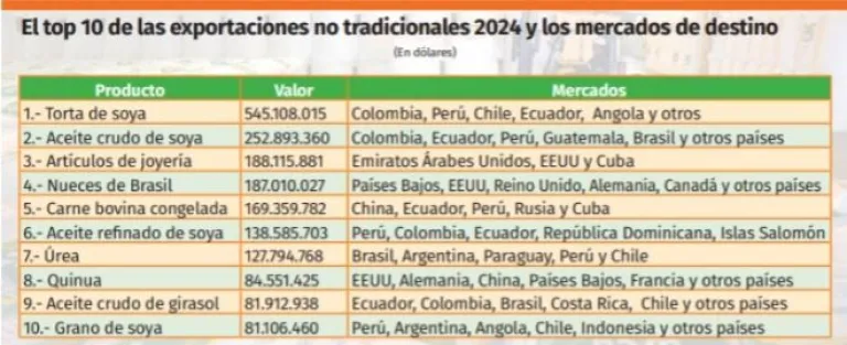 Indicó que, si bien el sector tradicional produce el 73% de las exportaciones, son recursos que se agotan en cualquier momento, por eso es que el país, con apoyo del ámbito público, debe apostar a un mayor desarrollo de las exportaciones no tradicionales y productos como la castaña, carne bovina y derivados, azúcar, sésamo, maní y alcohol.
