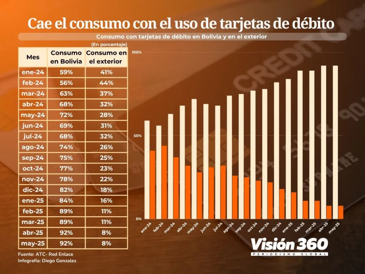 Explicó que el consumo en dólares con tarjetas de débito en enero del año pasado era de un 41% en el exterior y de 59% en el país, pero en mayo de este año, un 92% del consumo con estos medios de pago se hace en Bolivia, y solo un 8% fuera de territorio nacional, debido a las restricciones y la coyuntura económica.