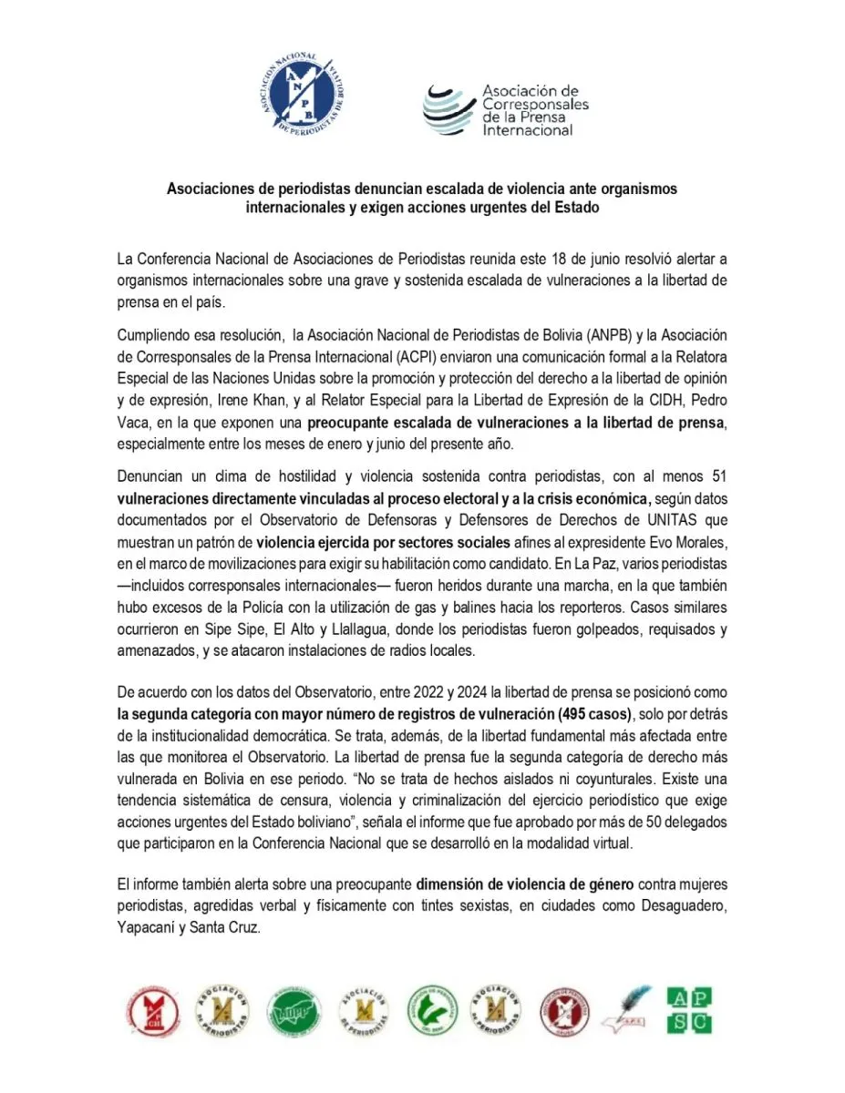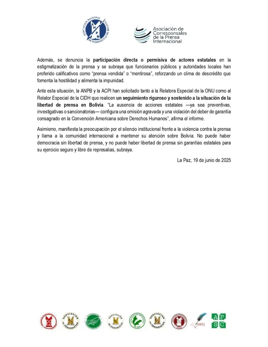 Cumpliendo esa resolución, la Asociación Nacional de Periodistas de Bolivia (ANPB) y la Asociación de Corresponsales de la Prensa Internacional (ACPI) enviaron una comunicación formal a la Relatora Especial de las Naciones Unidas sobre la promoción y protección del derecho a la libertad de opinión y de expresión, Irene Khan, y al Relator Especial para la Libertad de Expresión de la CIDH, Pedro Vaca, en la que exponen una preocupante escalada de vulneraciones a la libertad de prensa, especialmente entre los meses de enero y junio del presente año.