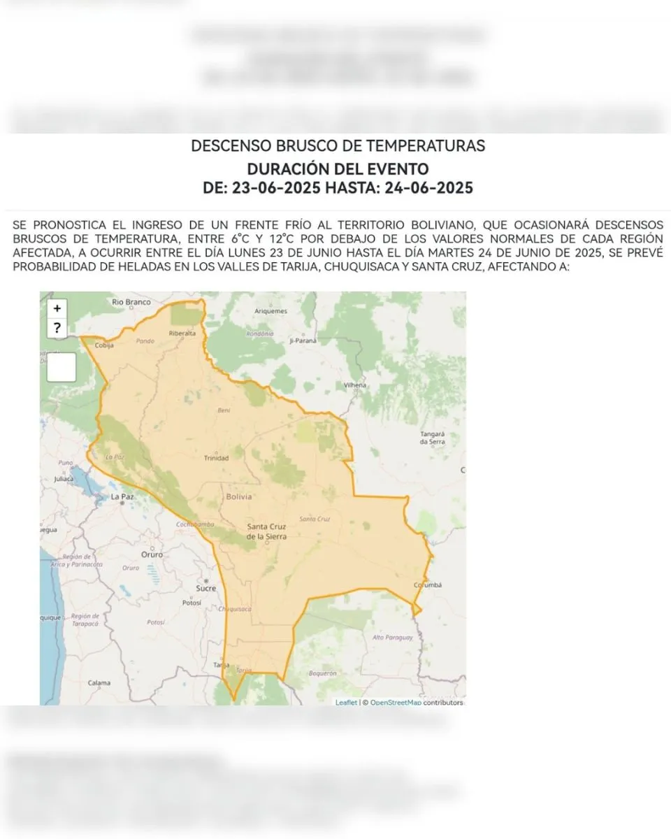 "(Se reportó) el ingreso de un frente frío al territorio boliviano que ocasionará descensos bruscos de temperatura, entre 6°C y 12°C por debajo de los valores normales de cada región afectada, a ocurrir entre el lunes 23 de junio hasta el día martes 24 de junio en La Paz, Cochabamba, Chuquisaca, Tarija, Santa Cruz, Beni y Pando", señala el reporte.