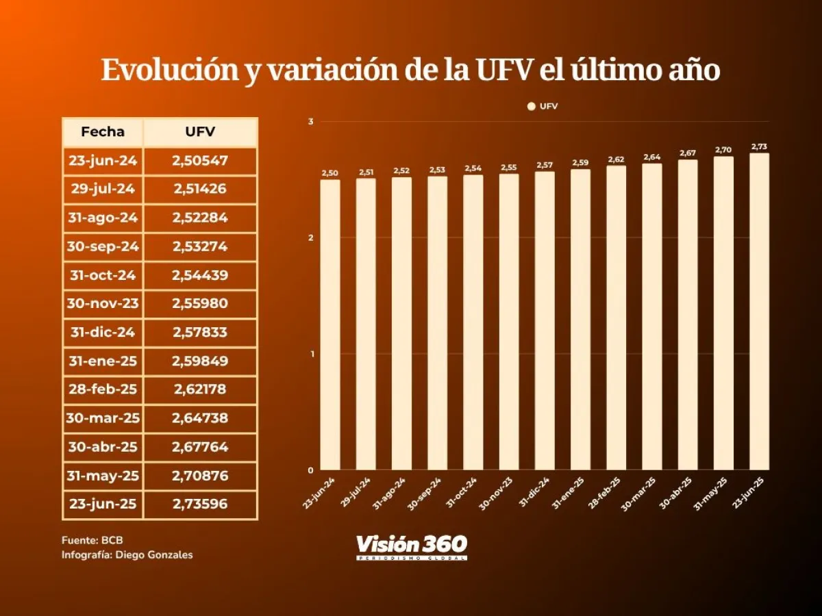 La cotización de la UFV es calculada por el Banco Central de Bolivia (BCB) y para este lunes una UFV es equivalente a 2,73596 bolivianos y, en comparación al valor de hace un año, aumentó en 9,2%. Pero si se hace la comparación con el valor que regía el 23 de junio de 2021 que era de 2.36814, el aumento a la fecha es de un 15,5%. Si se retrocede más, a 2019, el incremento es de 18,6%, porque ese año el 23 de junio la cotización de la UFV era de 2.30522 bolivianos.