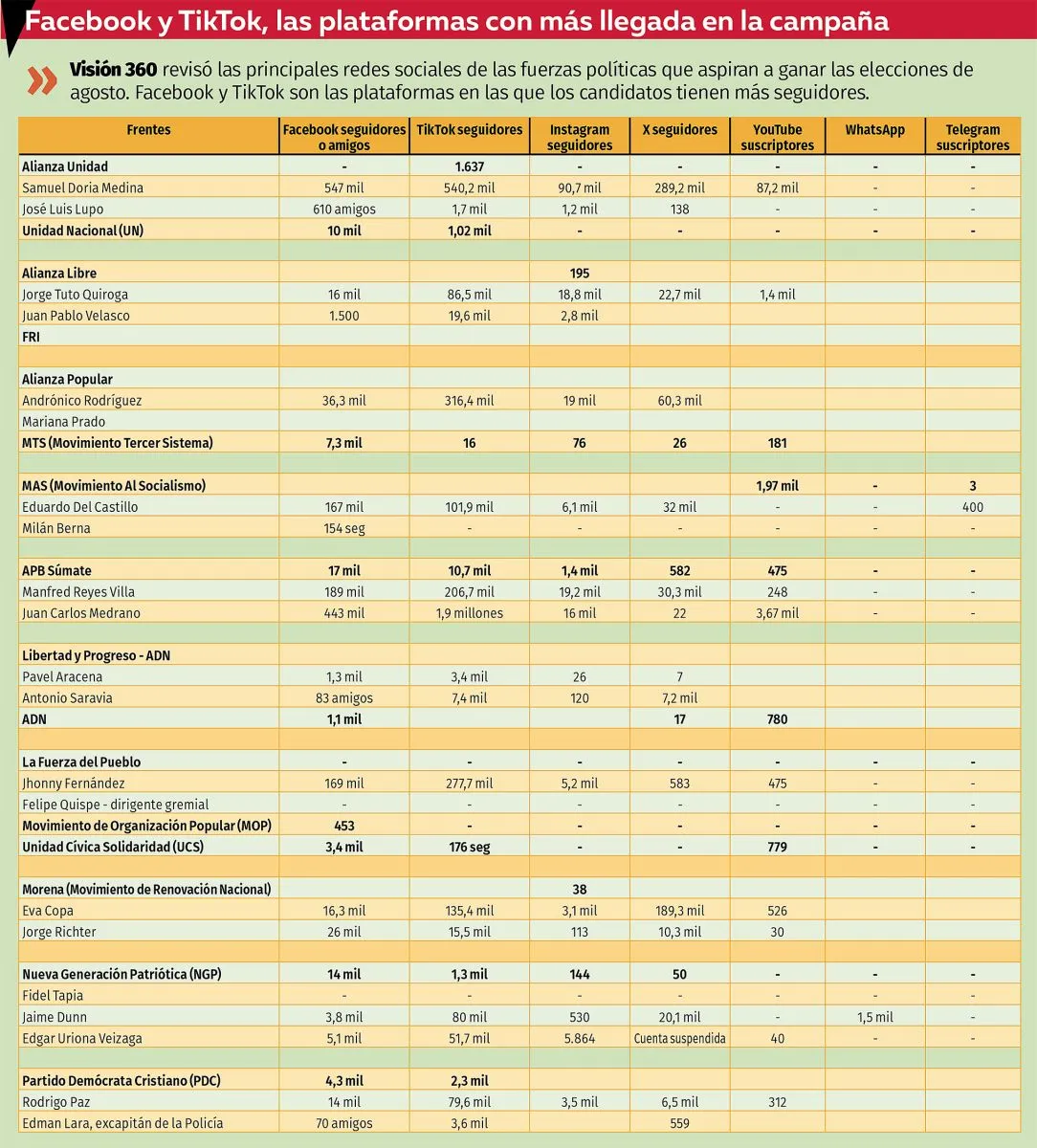 TikTok y Facebook son las plataformas más utilizadas por los candidatos y los diez frentes políticos para conquistar el voto de los ciudadanos bolivianos, de cara a las elecciones del próximo 17 de agosto. Les siguen Instagram y X, según una revisión periodística realizada por el equipo de Visión 360.