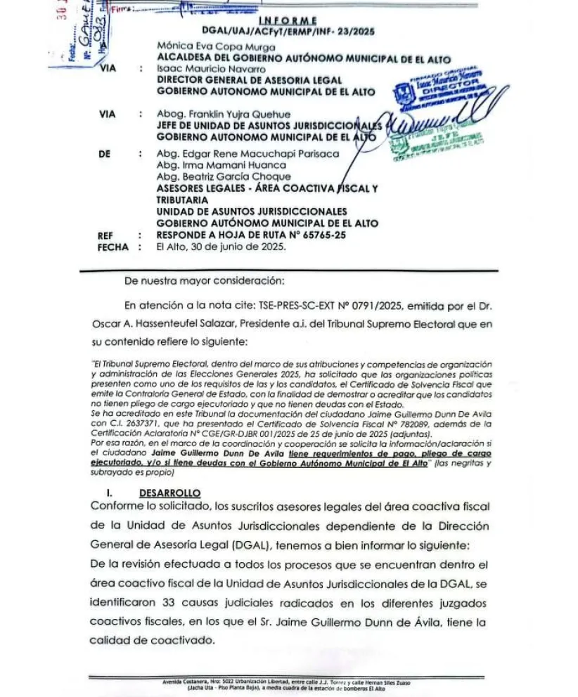 La Alcaldía de El Alto presentó este lunes al Tribunal Supremo Electoral (TSE) un informe sobre el candidato a la presidencia, Jaime Dunn, y ratificó que tiene cuentas pendientes con el municipio y 33 causas judiciales radicadas en diferentes juzgados.