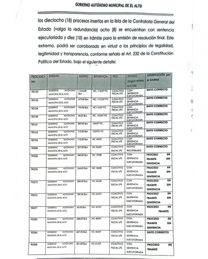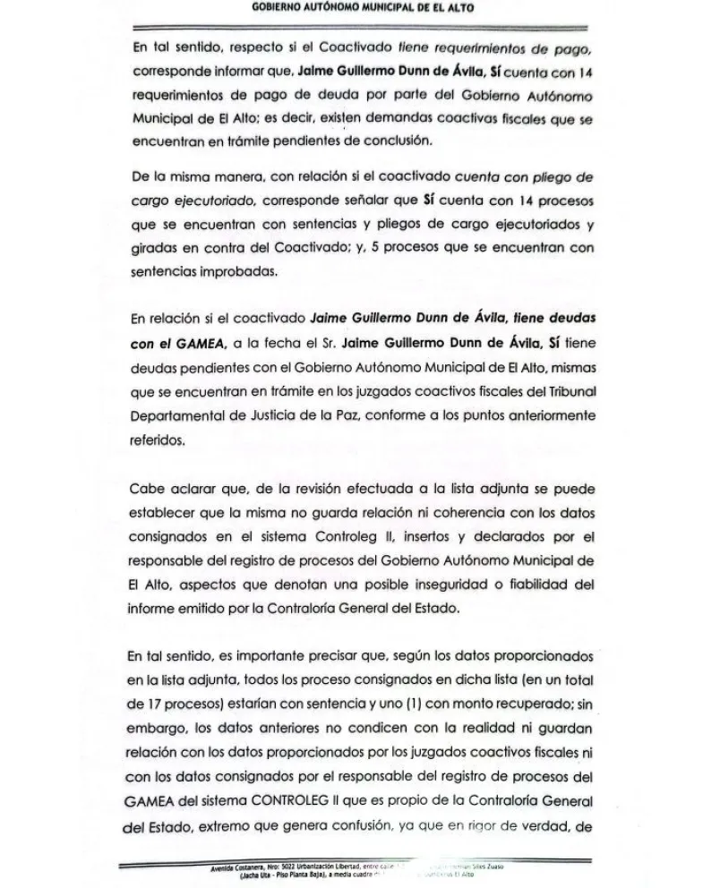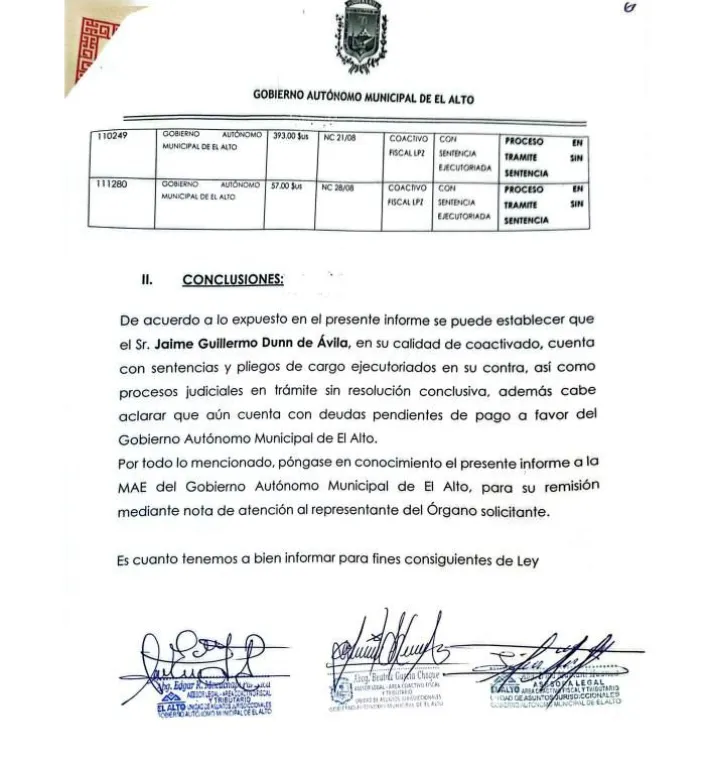 Según información de la Alcaldía de El Alto, Dunn tiene 33 procesos desde 2005, cuando fue consultor de la Alcaldía en la gestión del entonces alcalde José Luis Paredes. Además, señala que tiene 14 requerimientos de pago de deuda y que “existen demandas coactivas fiscales que se encuentran en trámite, pendientes de conclusión”.
