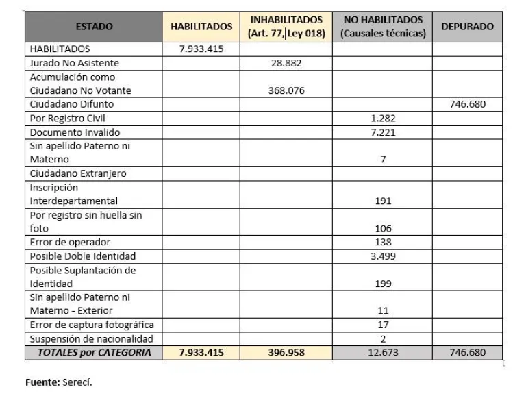 Según los datos del Serecí, 396.958 ciudadanos se encuentran como inhabilitados y 12.673 ciudadanos como no habilitados por causales técnicas o comprendidas por la normativa legal vigente, lo que hace un total de 409.627 ciudadanas y ciudadanos en listas.