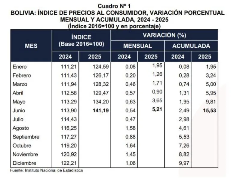 Inflación de junio llega a 5,21 % y la acumulada a 15,53 %, el INE responsabiliza a los bloqueos “evistas”