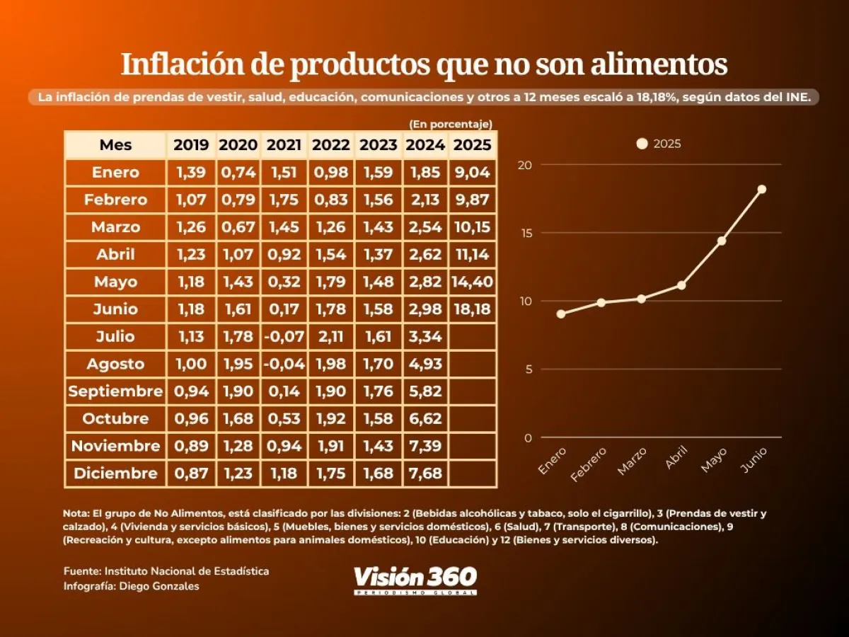 El aumento de precios en productos y necesidades que no son alimenticios, como la salud, transporte, educación, bebidas alcohólicas, ropa, educación y otros, aumentó en un año en un 18,18%, según el último reporte sobre el Indice de Precios al Consumidor (IPC), del Instituto Nacional de Estadística (INE).