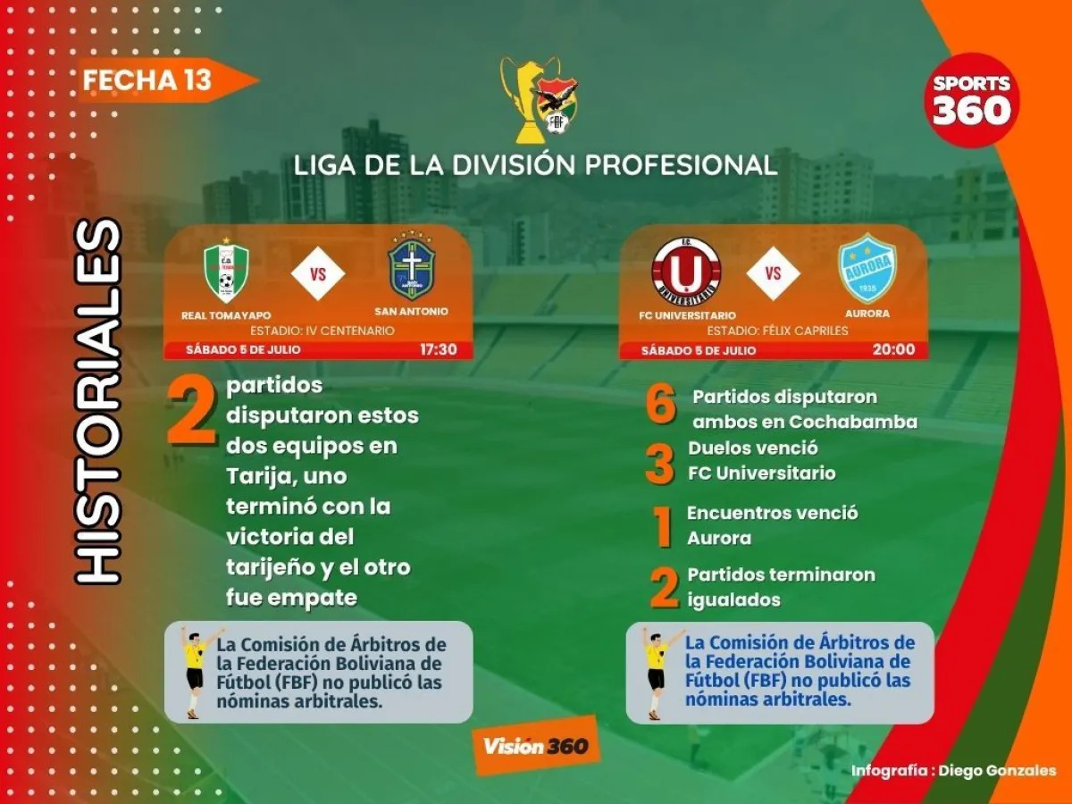 Real Tomayapo y San Antonio Bulo Bulo, dos clubes que pelean en la mitad de la tabla, jugarán en la tarde de este sábado —17.30— en el estadio IV Centenario de Tarija, el primer partido de la jornada 13 de la Liga de la División Profesional.
