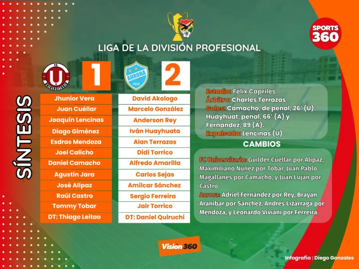 Con goles de sus debutantes Iván Huayhuata y Adriel Fernández, Aurora derrotó este sábado 1-2 a FC Universitario, este sábado en el estadio Félix Capriles de Cochabamba, por la jornada 13 del torneo Liga de la División Profesional.